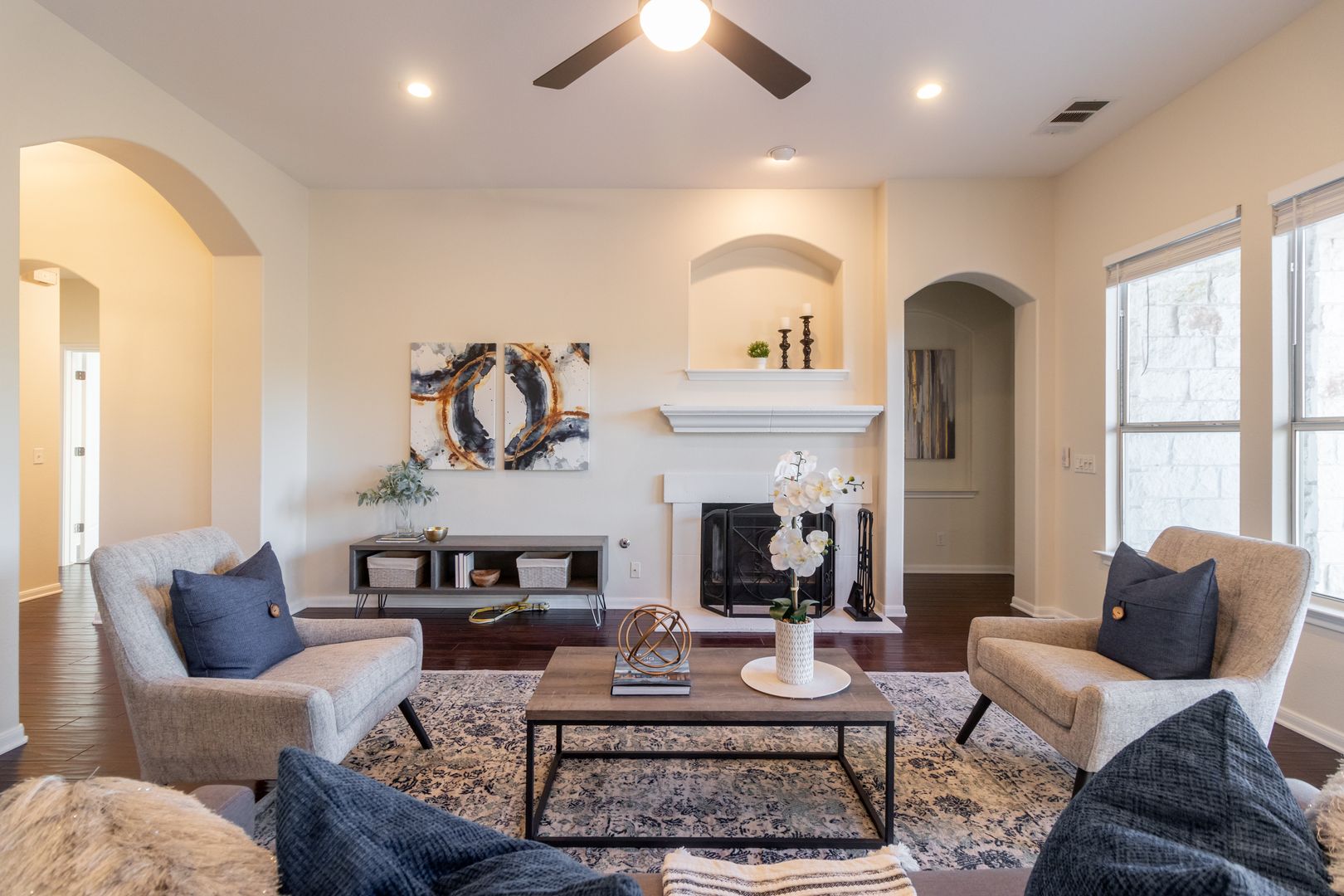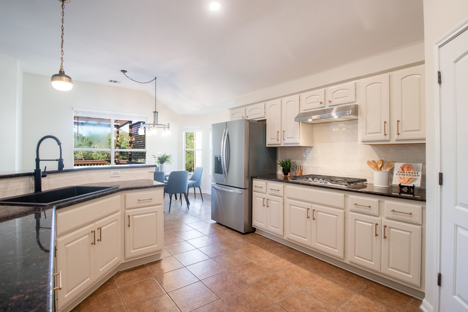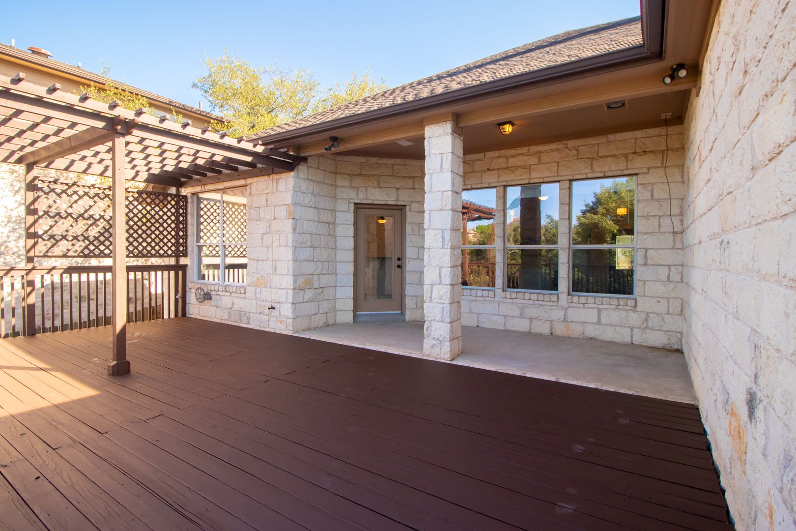 This newly renovated three-bedroom, two-bathroom house with dedicated office space perfect for working from home or as a quiet place to study. This house is located on a quiet cul-de-sac with a backyard that backs to a nature preserve, providing a sense of tranquility and seclusion. Upon entering the home you are greeted with an open floor plan, high ceilings, and plenty of natural light. The living room features large windows that provide ample natural light and a cozy fireplace perfect for the cooler months. The kitchen features stainless steel appliances, gas cooktop, granite countertops, a walk-in pantry, and plenty of cabinet space.The dining area is located adjacent to the kitchen and can accommodate a large table, perfect for hosting dinner parties. The primary suite features a large walk-in closet and spa-like en-suite bath complete with quartz countertops, a separate walk-in shower boasting dual shower heads, and a large soaking tub allowing you to unwind and recharge after a long day. The two guest bedrooms have walk-in closets and share a bathroom that has been beautifully updated. The private backyard features an expansive lawn and large deck, perfect for outdoor dining or relaxing. Other features of this home include hardwood floors throughout, a laundry room with storage, and a two-car garage. Additionally, the house is within walking or biking distance to nearby restaurants, shops, and the movie theater. The neighborhood also includes a community pool with a splash pad, a gym, a basketball court, and sports field, as well as several large parks, playgrounds, picnic areas, and an extensive network of walking trails perfect for exploring the hill country.